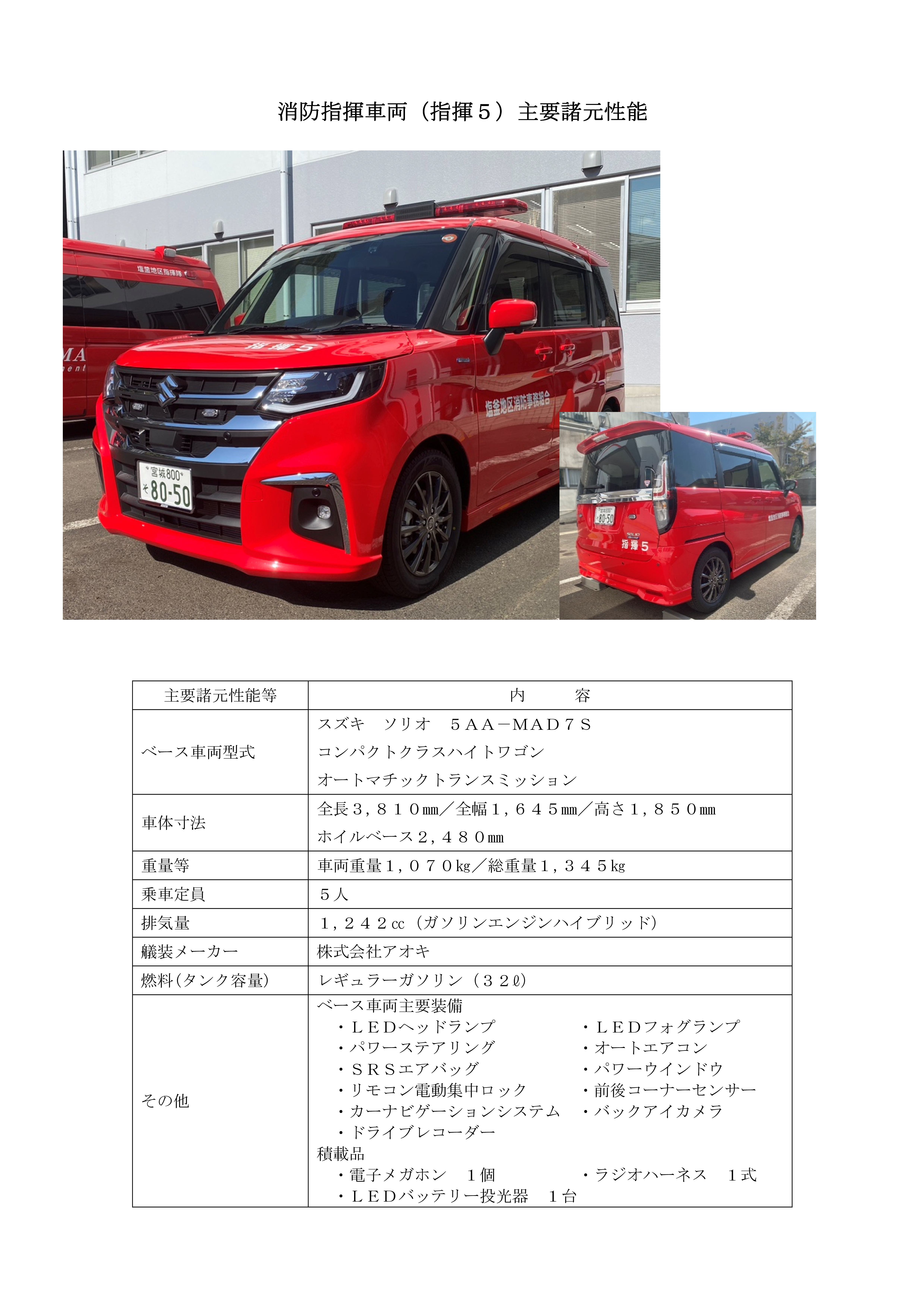 当消防本部では、令和7年度事業として、利府消防署に配備の消防指揮車両(利府指揮5)を更新整備し、令和7年10月15日(水)から運用を開始しました。