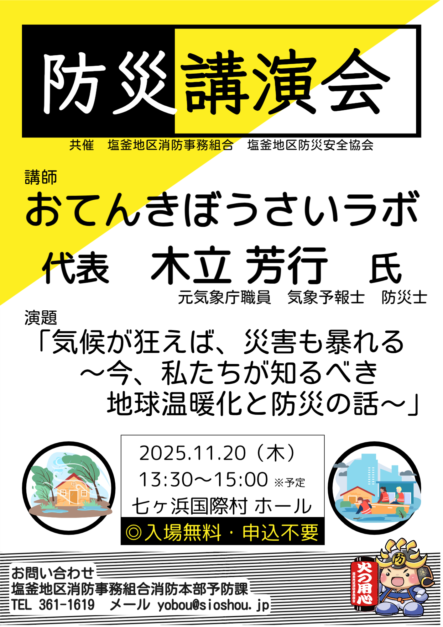 11/20(木) 13:30~15:00 七ヶ浜国際村ホールで防災講演会を開催します。