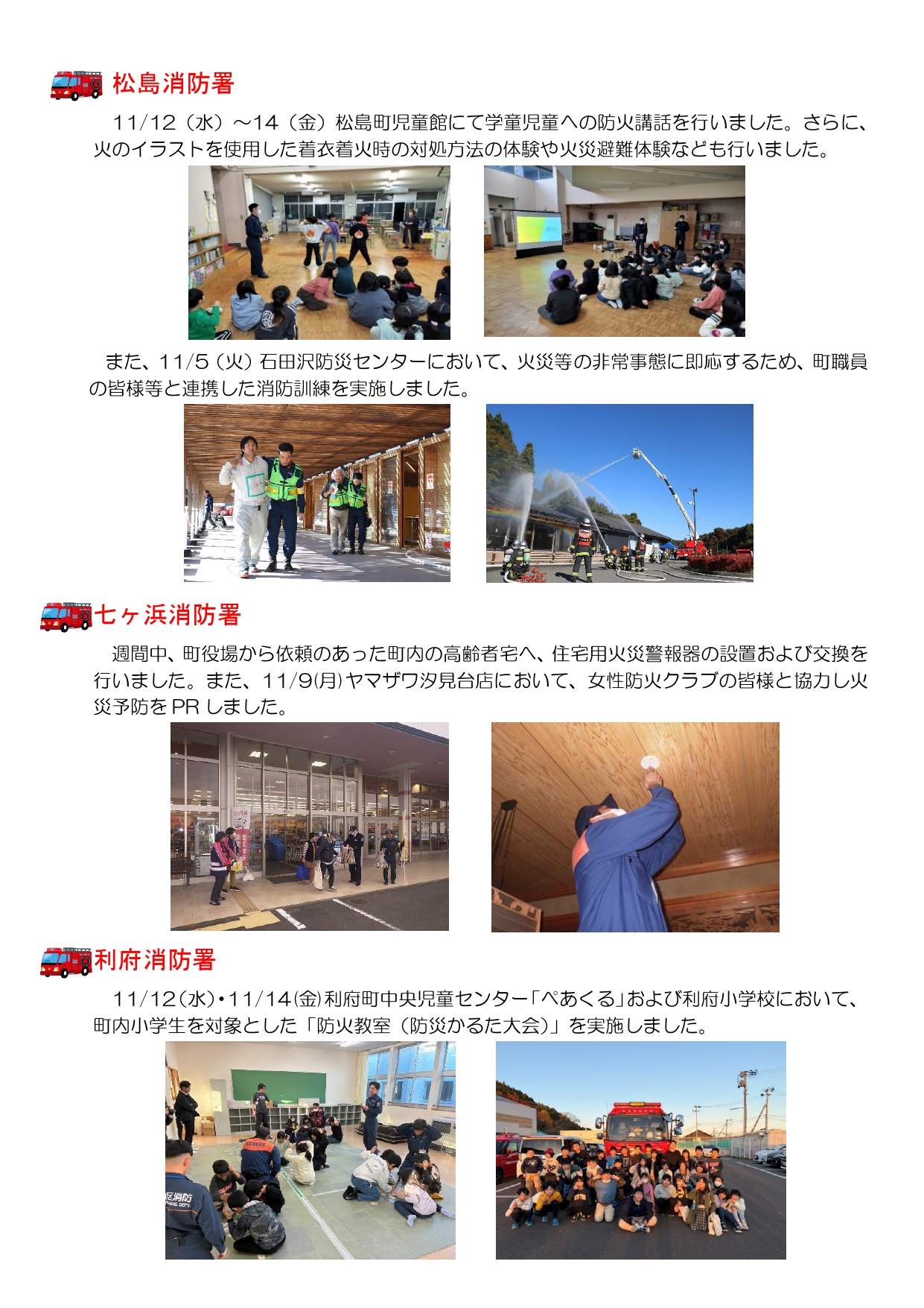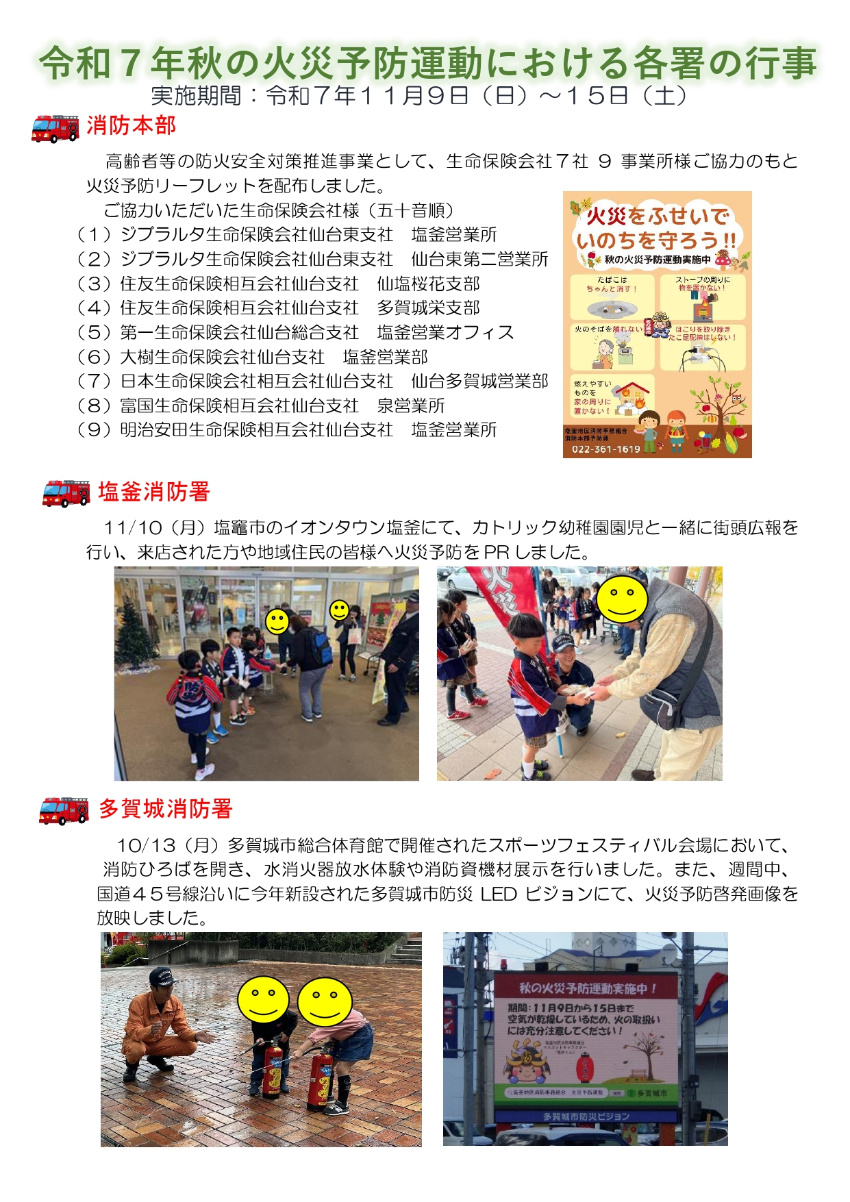 令和7年秋の火災予防運動実施結果!令和7年11月9日から15日までに、塩釜地区管内の各地で秋の火災予防運動が実施されました。期間中ご協力いただきました関係者の皆様、ありがとうございました。