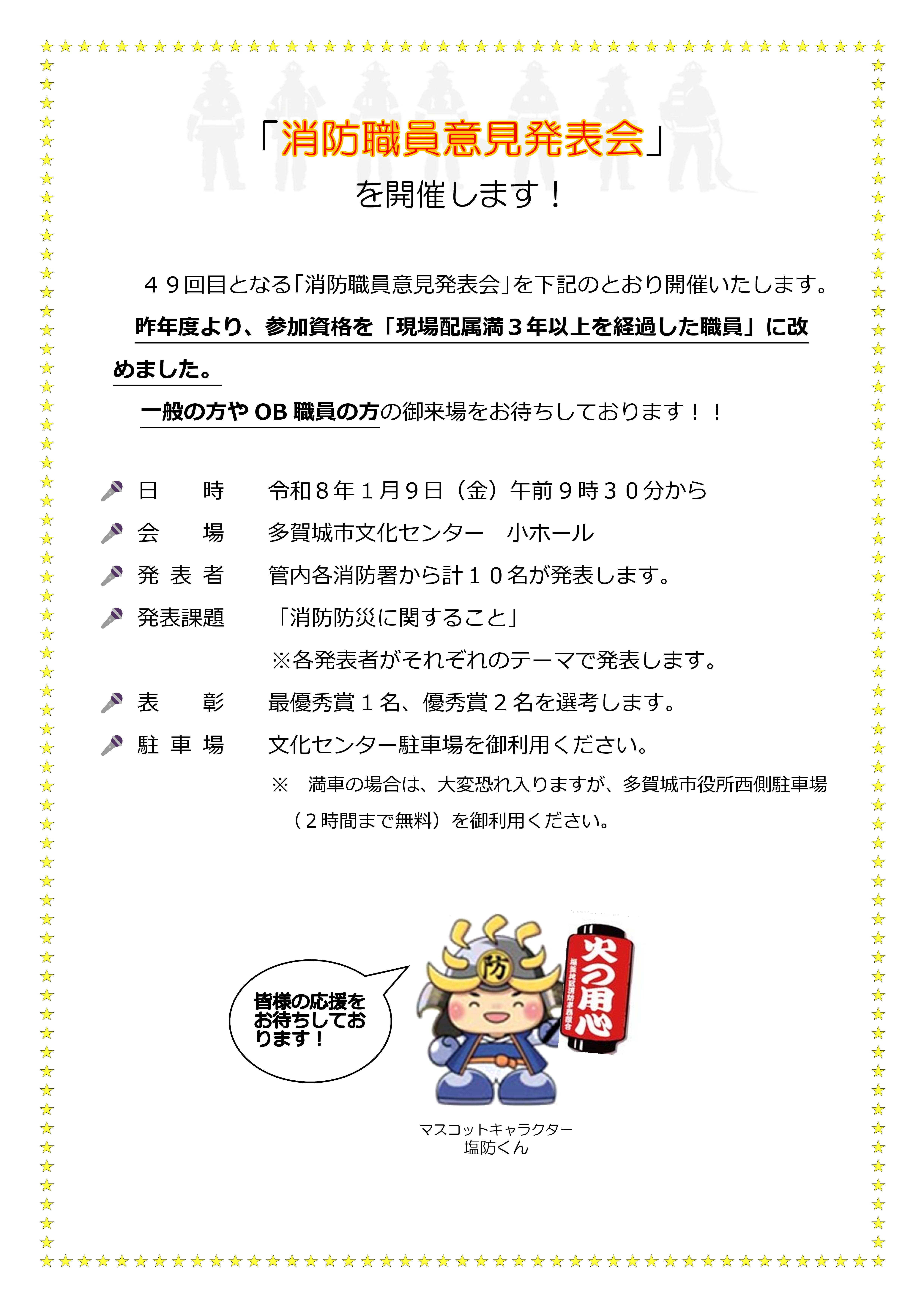49回目となる「消防職員意見発表会」を令和8年1月9日(金)午前9時30分から多賀城市文化センターで開催します!若手消防職員が消防防災に関する内容をそれぞれのテーマで発表します。 一般の方やOB職員の方の御来場をお待ちしております!!