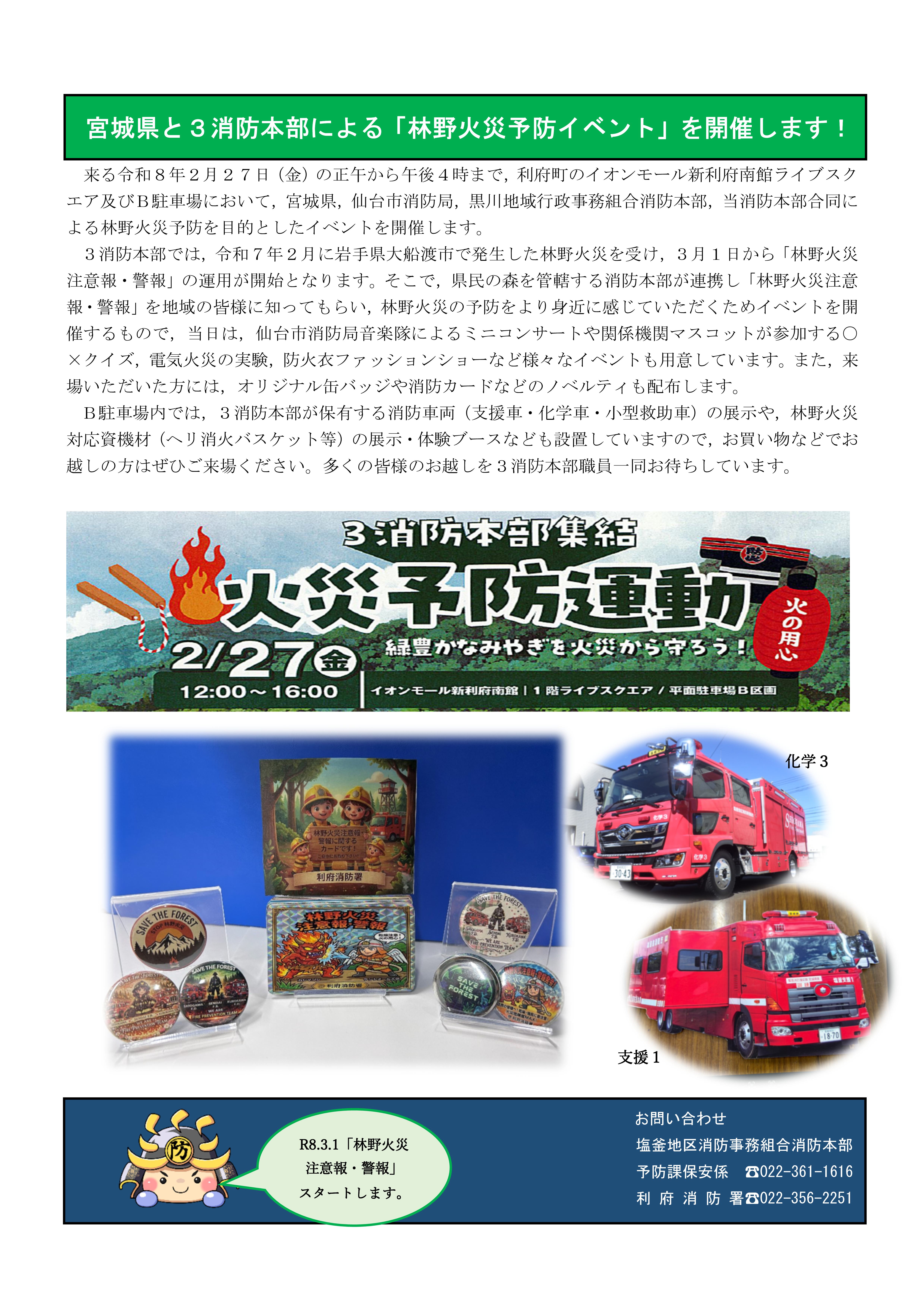 令和8年2月27日(金)正午から,イオンモール新利府南館のライブスクエア及びB駐車場内において,宮城県と仙台市消防局,黒川地域行政事務組合消防本部,当消防本部の3消防本部合同による林野火災予防イベントを開催します。